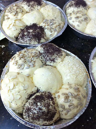 Dividir la masa en tres partes iguales, y a cada parte, dividirla en 6 bollitos y ahora armar las jalot,como se ve en la foto, En las bandejas descartables redondas,las mas chicas, formar una flor con los bollitos, 5 alrededor de la bandeja y uno en el centro. Calentar el horno a temperatura media, 180 grados.