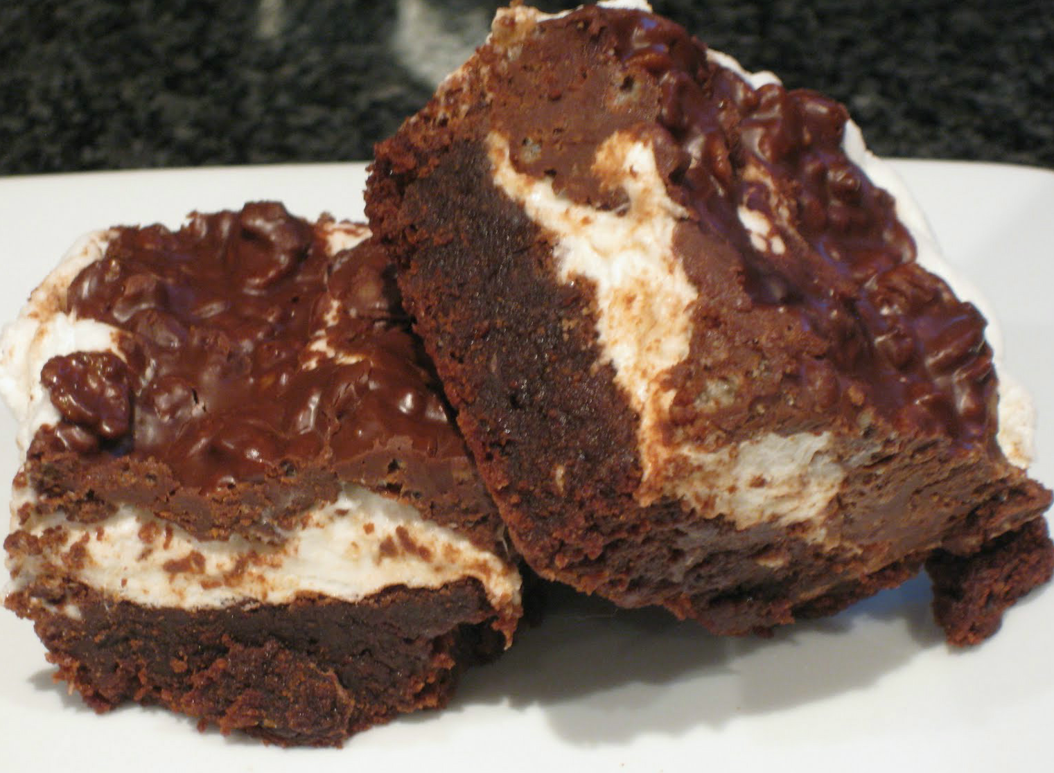 Mezclar todos los ingredientes de la receta de brownies, dividir la masa en dos. La primera mitad pasarla al molde de hornear ya aceitado, por encima agregar las galletitas de chocolate en pedacitos y por arriba los mini marshmallows, por ultimo, agregar la otra mitad de los brownies. Hornear en horno medio por 20 o 25 minutos como máximo. Tiene que quedar mojadita.