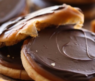 Sacar y mientras se enfrían preparar el dulce de leche mezclado con la leche y colocar en cada una de las galletas. Derretir las chispas de chocolate con la manteca y cubrir el dulce de leche.