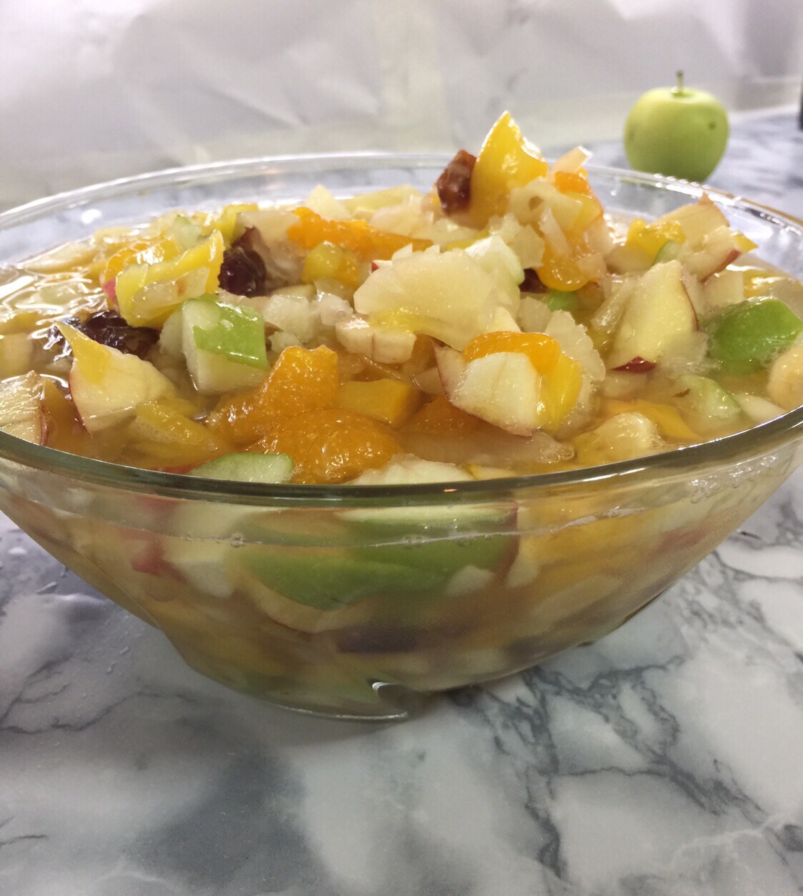 Cortar todas las frutas en cuadraditos, exprimir los jugos y volcarlos sobra la ensalada.