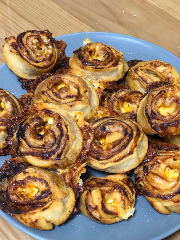 Sacar la masa de la nevera dividir en dos. Extender cada mitad en un rectángulo grande,untar la mezcla de salsa de tomate y sobre cada rectángulo y espolvorear con ambos quesos, enrollar como un rollo de jalea, cortarlo en rodajas y colocar en una bandeja para hornear.