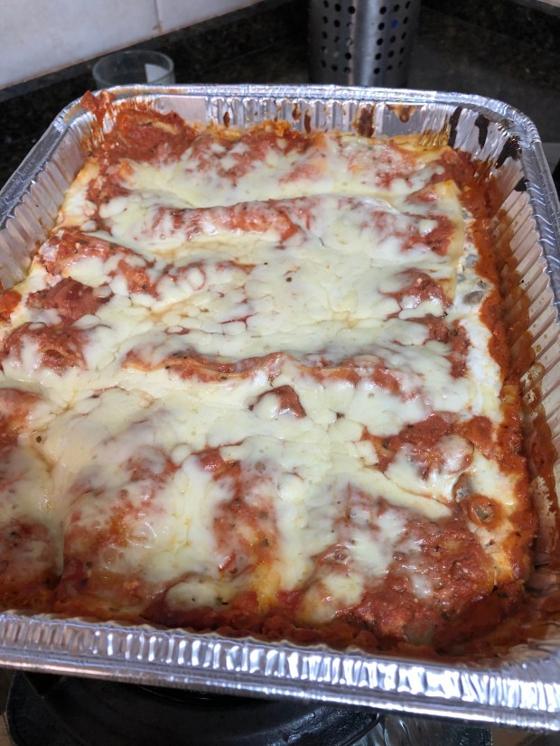 En una bandeja mediana rectangular (9×13 americano) empezar poniendo la salsa, que sea suficiente par cubrir la base de la fuente, poner los fideos, deben entrar tres, uno al lado del otro, cubrir con salsa y encima 1/3 del queso, continuar de esta manera y terminar con queso por último.